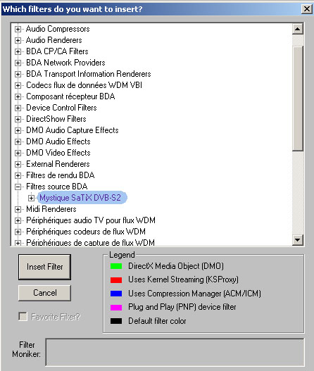 Pour pouvoir relier les deux filtres 'Microsoft DVBS Network Provider' et 'Mystique-SaTiX DVB-S2' il faut avant avoir paramétré le filtre Microsoft DVB Network Provider et faire un 'tuner request' (demande de réglage). après ils se connectent sans problème.