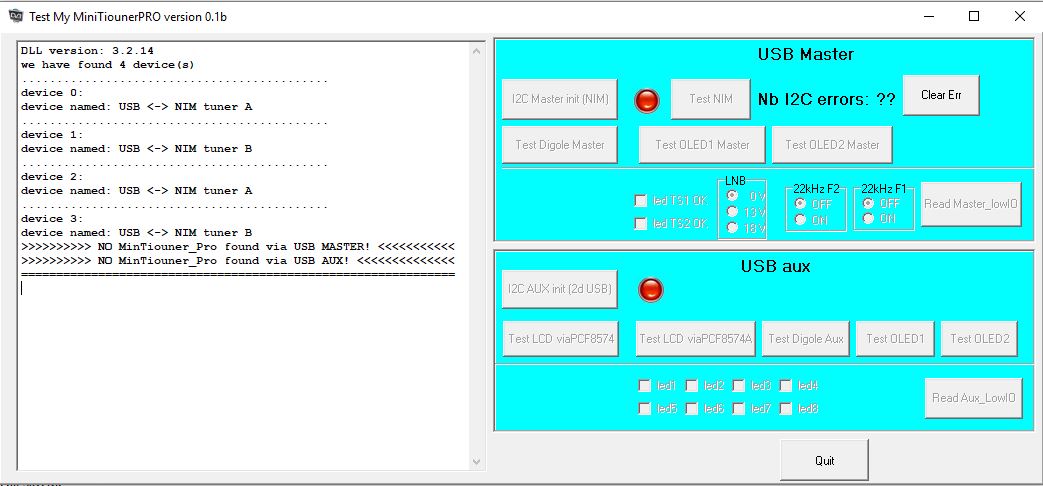 c'est bien le logiciel TestMyMiniTiounerPro qu'il faut utiliser et celui-ci dit qu'il ne trouve pas de MiniTiounerPro car il trouve des device dont le nom est "USB <-> NIM tuner A"