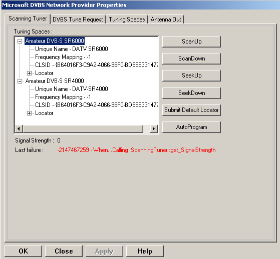 Je ne peux pas arriver au menu 'Microsoft DVB-S Network Provider Properties'. Si je fais un clic a droit sur le filtre et puis sur 'Properties', il dit "The requested property page could not be displayed'.
