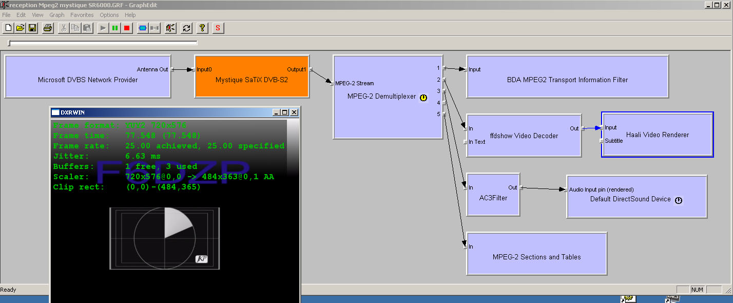 Pour pouvoir relier les deux filtres 'Microsoft DVBS Network Provider' et 'Mystique-SaTiX DVB-S2' il faut avant avoir paramétré le filtre Microsoft DVB Network Provider et faire un 'tuner request' (demande de réglage). après ils se connectent sans problème.