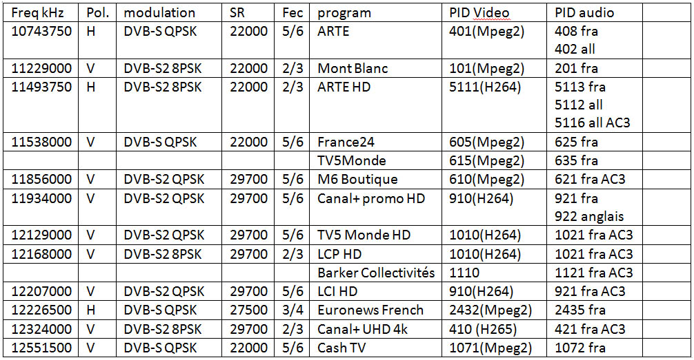 Vous pouvez tester votre MiniTiounerPro en recevant des chaines TV par satellite. Il y a 14 chaines TV en français en clair sur ASTRA.