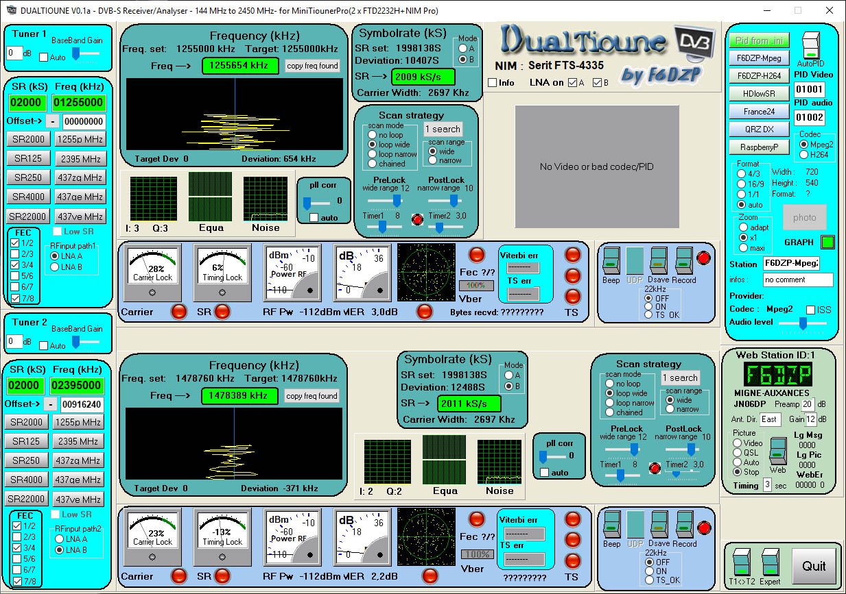 The FTS4334L NIM has 2 tuners ( only one Fplug input will be used for Oscar-100 as all stations are on the same band from the same LNB) and 2 demodulators, so we can receive and demodulate 2 stations at same time.